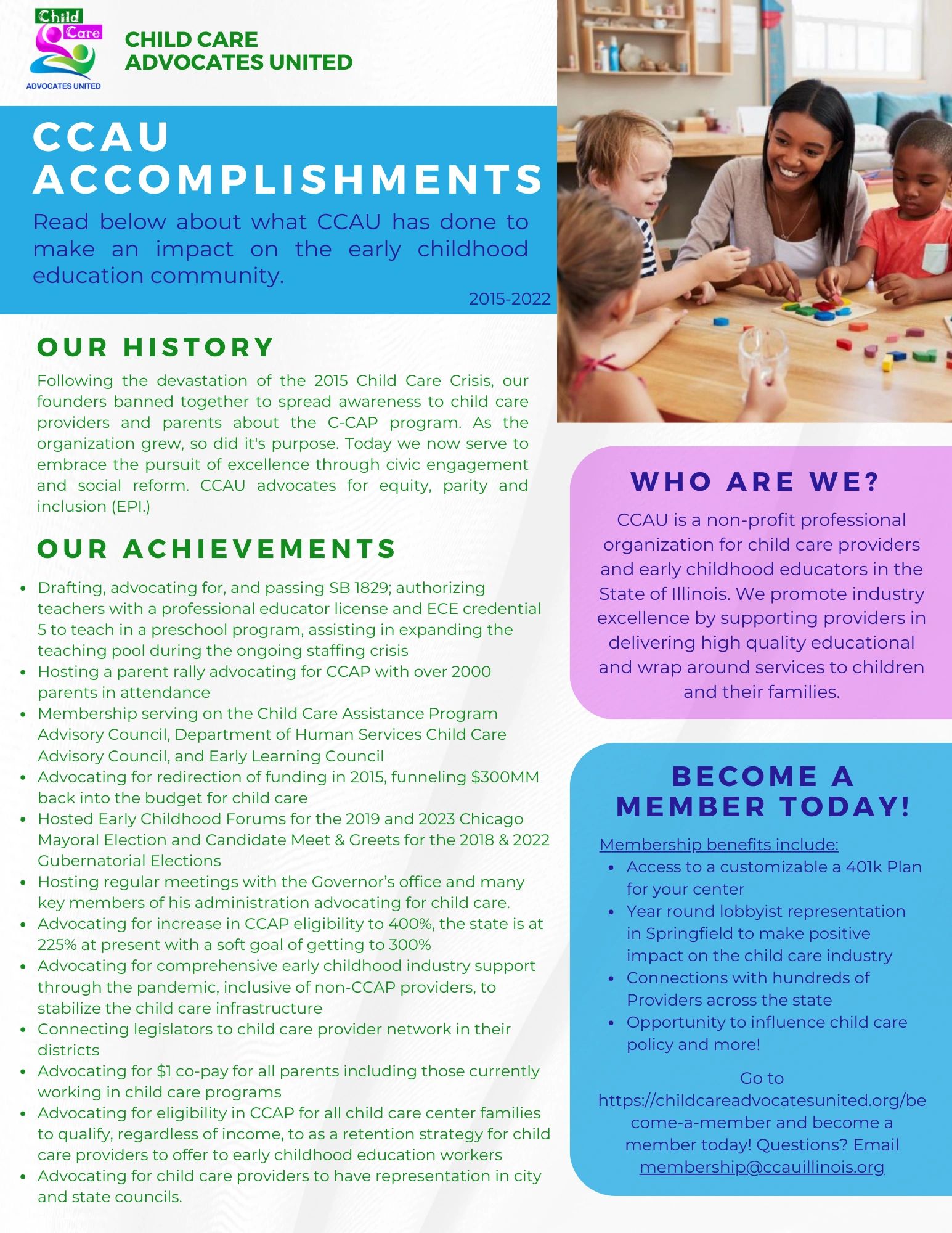 CCAU has been promoting the Child Care Industry for 7 years. Following the devastation of the 2015 Child Care Crisis, our founders banned together to spread awareness to child care providers and parents about the C-CAP program. As the organization grew, so did it's purpose. Today we now serve to embrace the pursuit of excellence through civic engagement and social reform. CCAU advocates for equity, parity and inclusion (EPI.)